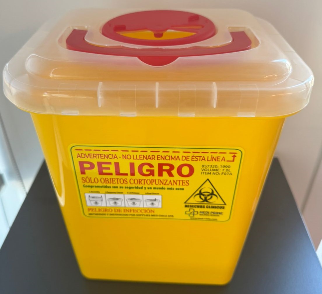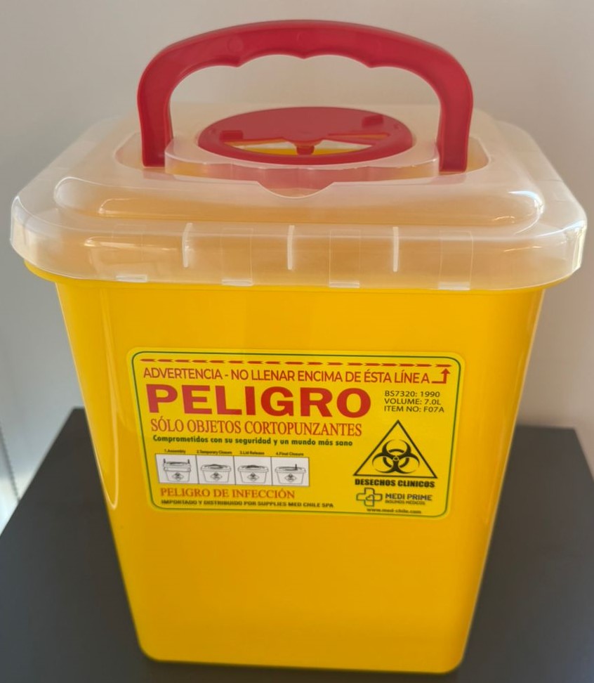 Contenedor para cortopunzantes 7 L amarillo, diseñado para la recolección de residuos de agujas, objetos punzantes y cortantes en hospitales, consultorios médicos y centros de salud.