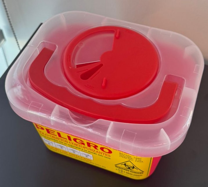 Contenedor para cortopunzantes 3 L rojo, diseñado para la recolección de residuos de agujas, objetos punzantes y cortantes en hospitales, consultorios médicos y centros de salud.